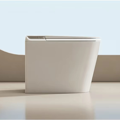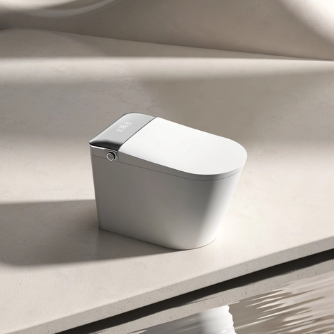 Inodoro inteligente sin tanque montado en el piso con apertura y descarga automáticas de la tapa, asiento con calefacción, pantalla digital, control remoto